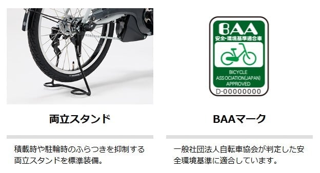 (注3) PASの走行できる距離は走る場所や走り方によって変わります。1充電あたりの走行距離は、車種によって異なるほか、道路状況、走行モード、走り方、気温、車載重量などによって変わります。なお、表記されている走行距離は標準パターンで測定した値であり、1充電あたりの走行距離を保証するものではありません。目安としてご活用ください。 *バッテリー新品、常温15~25℃、車載重量(乗員および荷物を合計した重量)65kg、平滑乾燥路面、無風、無灯火状態、製造業者指定のタイヤ空気圧で、平坦路(1km)、勾配4度の上り坂(1km)を含む全長4kmの標準走行路を設定し、平坦路「変速ギア・3」15km/h、上り坂「変速ギア・2」10km/h、下り坂「変速ギア・3」20km/hで走行し、1kmごとに一旦停止を行ったときのテストデータ。