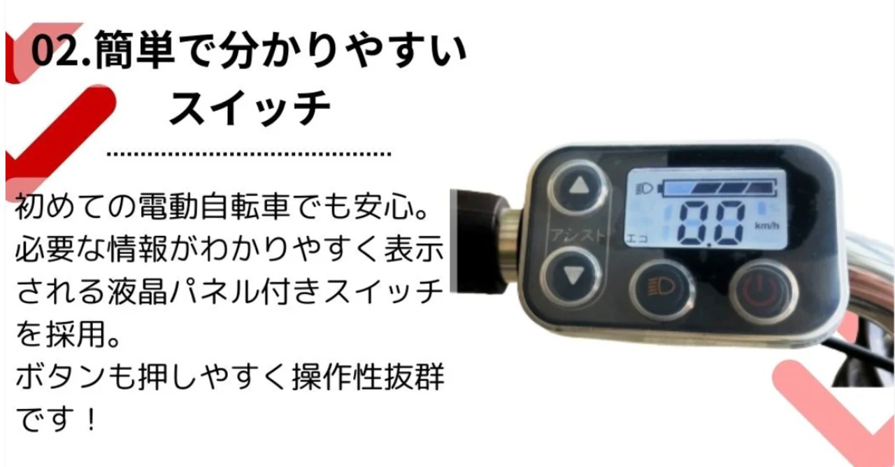 ⾛⾏距離:8AH:エコモード 約42km 標準モード約35km 強モード 約28km