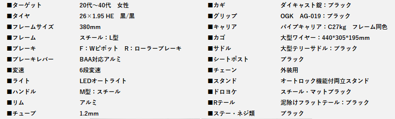 その上、BAA・外装6段・オートライト・座り心地の良い大きなサドル・荷物がたっぷり入る大きなカゴ・後同乗器が取付け出来るパイプキャリア・嫌な音鳴りがしにくいローラーブレーキ・盗難されにくい頑丈なカギと機能も充実しているから乗る人を選ばない優れもの