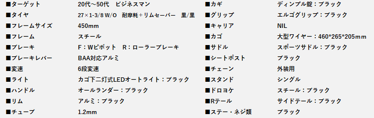 ビジネスバックがすっぽり入る大きなを標準装備。泥除けとチェーンケースを装備しているのでスーツへの泥はねを気にせず大丈夫。外装6段変速付きなので長い距離でも快適走行。二灯式LEDオートライトなので暗い夜道でも安心走行。BAAも標準装備。朝早くから夜遅くまで働いているビジネスマンのためのビジネスクロスで快適走行を演出。