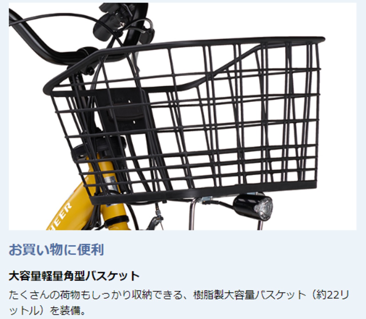 「PAS CHEER」は、初めて電動アシスト自転車を利用する方向けに、日常使いに必要な機能は十分に備えつつ、高いコストパフォーマンスを実現したモデルです。主な機能は、スタンドを掛けるとハンドルがロック(半固定)される「スタンド連動式ハンドルストッパー」、てこの原理で軽い力でスタンド掛けができる「かるっこスタンド」、跨ぎやすく乗り降りしやすい低床U型アルミフレームの採用などです。
